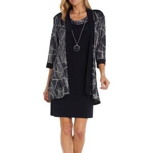 R & M Richards Women’s Printed Jacket Two Piece Dress Navy Plus Size 16