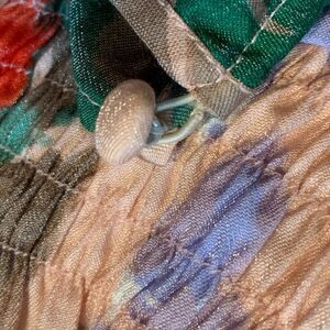 Sleeveless dress with elasticated waist and lined skirt. Elastic loop to fasten button is frayed a little.