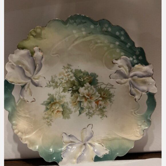 R S Germany Cut Out Handled. Cake Plate or Bowl Hand Painted Floral. 11" Porcelain. Shallow bowl or serving plate. 3 white Irises (flags as Grandma called them). 1.7" deep. Note pics for small chip on edge. Easel not included.