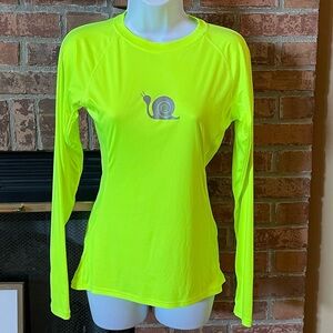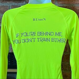 One of my favorites and I think I wore it once. Love the zippered pocket on the arm. "If you're behind me, you didn't train either" with a snail on the front. Fitted and so bright. Smoke free home.