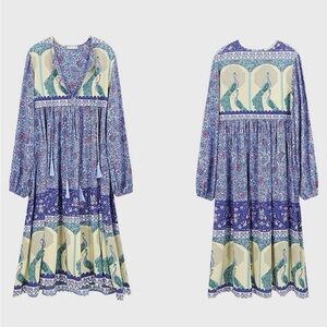 R. VIVIMOS Boho Peacock Printed Beachy Flowy Blue Tassel Tie Summer Floral Dress