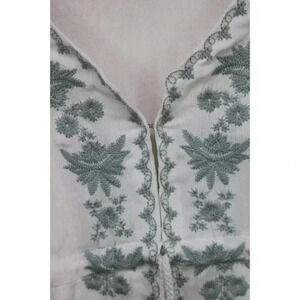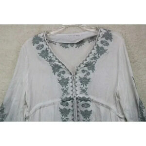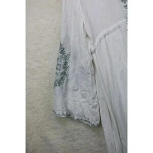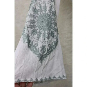 This is a R. Vivimos Hi Lo Women's Embroidered Bohemian Style Dress that is a size Large. It is 65% Cotton and 35% Polyester. It measures: Armpit to armpit-21.25" and the lengths are 34.5" and 46". It has flared long sleeves that have embroidery on them. In Good Condition.