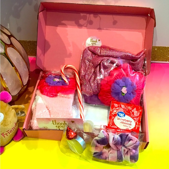 Your box contains a custom satin bonnet, custom socks, satin pillowcase, hair scrunchies, essential oil tea light candle, sample essential oil whipped hand cream, individual wrapped tea bag and a few savory treats
