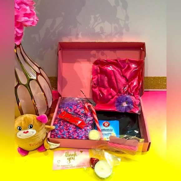 Your box contains a custom satin bonnet, custom socks, satin pillowcase, hair scrunchies, essential oil tea light candle, sample essential oil whipped hand cream, individual wrapped tea bag and a few savory treats
