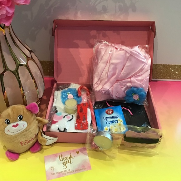 Your box contains a custom satin bonnet, custom socks, satin pillowcase, hair scrunchies, essential oil tea light candle, sample essential oil whipped hand cream, individual wrapped tea bag and a few savory treats