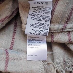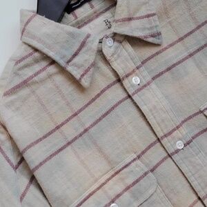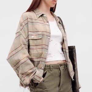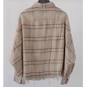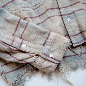 Stylish R13 button down shirt. Beige plaid pattern. Frayed hem for a casual look. Perfect for layering.