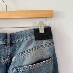 Wide-leg jeans with frayed turn-up cuffs, distressed details and a unique crossover waist.