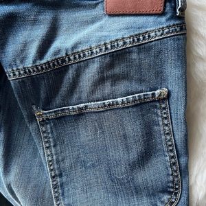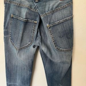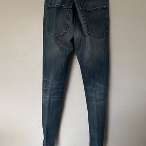 NYC Brand R13's iconic Xover jean with narrow legs. 2 slash pockets in front & 2 patch pockets in back; 1 asymmetrical change pocket in front