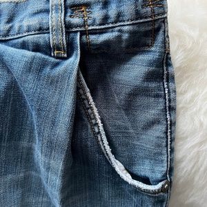 Crosses over at waistline in both front & bath of jean - nice and baggy below the crossover, then tapering into narrow legs