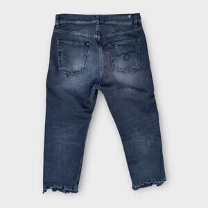 These relaxed, dark-washed jeans made from non stretch denim are roughed up with tattered hems, abrasions and a whiskered finish for signature tomboy cool. Wash: Jake Black Size: 27 27=4 High rise. Approximate measurements laying flat: Length 38" Inseam 26" Waist 16" across 16" leg opening Zip fly with button closure Five-pocket style 100% cotton Machine wash, dry flat Made in Italy Style R13W5083-394A Condition: Brand new without tags