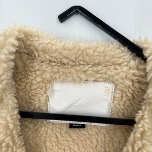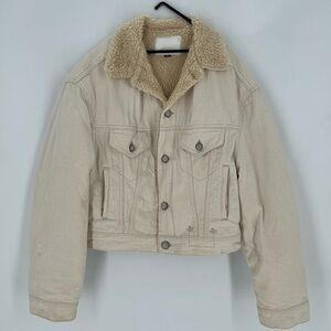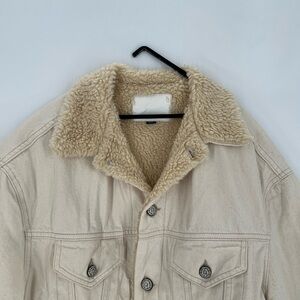 Oversized sherpa trucker jacket with intensional distressing with distressed logo buttons and speckled distressed ivory denim fabric.