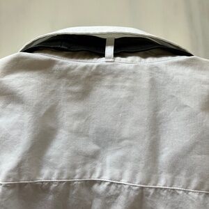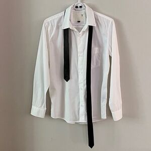 The R13 shirt is a classic and stylish button-up top designed for unisex adults in size M. Made from cotton with a solid white color and an accompanying black leather tie, this shirt features a button-down collar, long sleeves, and a classic fitted sleeve type. Perfect for everyday wear, this basic yet fashionable top exudes a timeless appeal with its Italian craftsmanship. Ideal for those who appreciate quality and style, this shirt from R13 is a versatile addition to any wardrobe. It measures 20" from pit to pit and 29" from collar to hem. Excellent condition as shown in the photos.