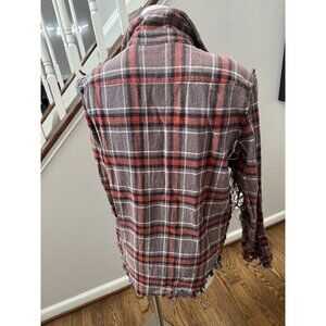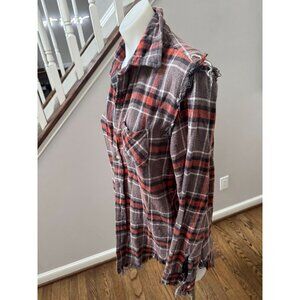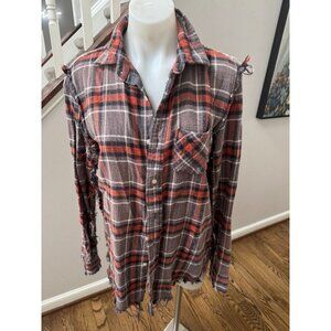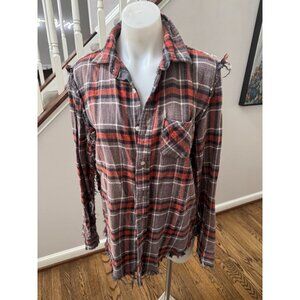 R13 Shredded Seam Button Down Shirt in Red & Charcoal Enzyme Plaid Flannel Size XS