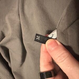 Worn twice, I see no holes or stains. Boxy fit.