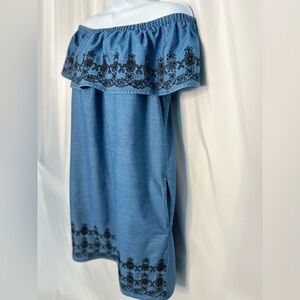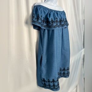 R1893 elegant off-shoulder dress featuring intricate black embroidery. 2 side pockets. Perfect for any occasion.