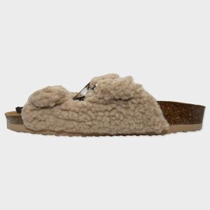 Plush slip on slides come new with tags making this a perfect gift this holiday season. Features a Birkenstock style with a tan plush Sherpa double strap with silver toned buckles. Created with a soft faux fur foot bed and padded insole for added comfort.