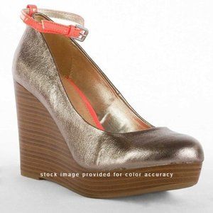 Larissa by R2. Brand color name is Gunmetal and is metallic. Fluorescent neon orange ankle strap accent. Round toe. Faux wood wedge heel appx 4". Platform appx 1". Original box.