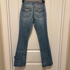 These blue denim jeans feature a light to medium wash with natural fading and whiskering patterns, offering a casual and stylish look. The denim material provides a comfortable fit with a lived-in appearance, perfect for everyday wear. Used in good condition.