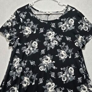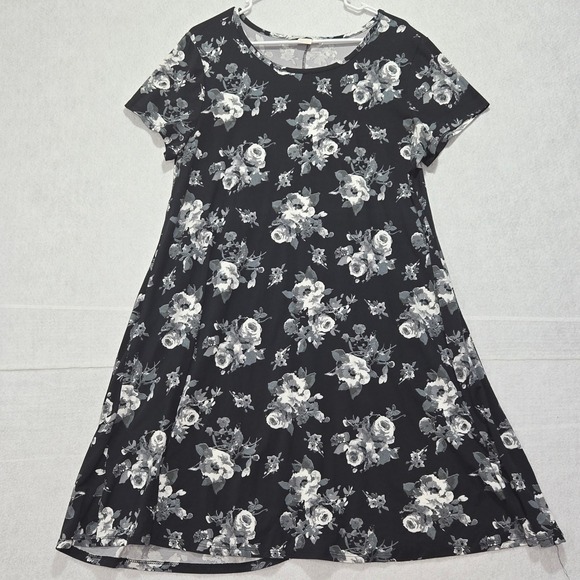 Jamie & Layla black short sleeve swing dress with a grey and white floral print. This comfortable and versatile dress features a flattering A-line silhouette and a crew neckline, making it perfect for casual outings or a relaxed day at home.