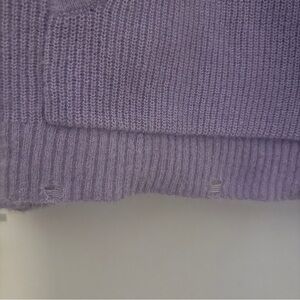 Soft and slouchy lavender knit hoodie by R898 featuring a front pouch pocket, cozy drawstring hood, and subtle intentional distressing at the cuffs and hem for a worn-in, effortlessly cool look. Never worn – comfy meets edgy in the best way.