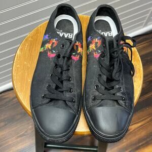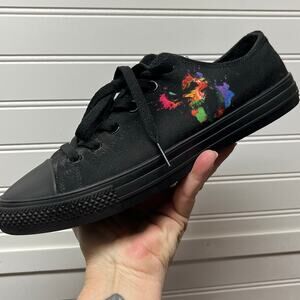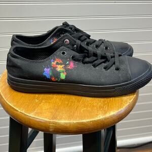 EUC is a pair of black multi colored paint splatter lowtop tennis shoes.