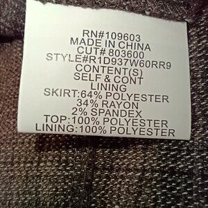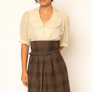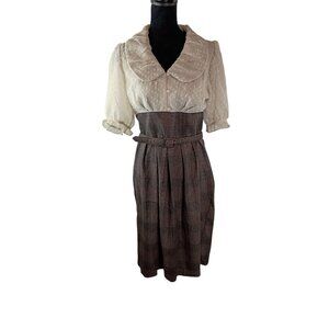 Women's Vintage Midi Dress by Rabbit Rabbit Rabbit featuring a two-tone design. The upper part is a sheer, cream-colored blouse with a polka dot pattern, short Puffy sleeves, and a ruffled Puffy collar with button details. The lower part is a knee-length, dark brown tweed skirt with a fitted waistband and pleated front. A matching belt around the waist, giving it a structured yet elegant appearance. The dress features a romantic, vintage-inspired design. Vintage from the 2000's.