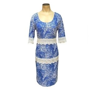 Stunning Dress, blue and white floral lace with thick white lace trim. Fitted style with plenty of stretch for the perfect silhouette. Fully lined with back zippered closure. 3/4 length sheer sleeves with detailing. The pictures truly do not do this dress just it’s absolutely gorgeous!