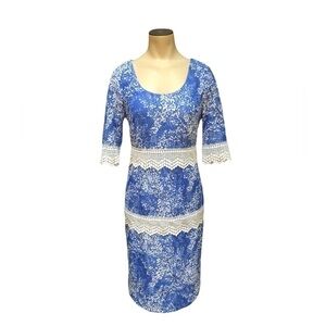 Stunning Dress, blue and white floral lace with thick white lace trim. Fitted style with plenty of stretch for the perfect silhouette. Fully lined with back zippered closure. 3/4 length sheer sleeves with detailing. The pictures truly do not do this dress just it’s absolutely gorgeous!