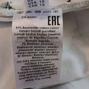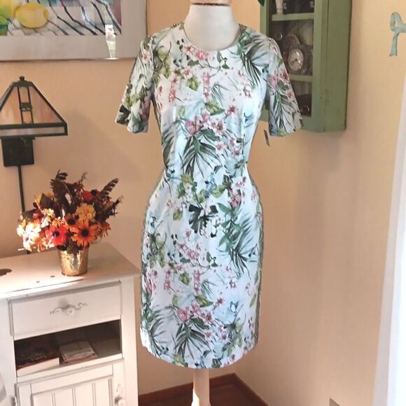 Beautiful and unusual. Lovely floral graphics with birds. On the sides, a multi-colored ribbon. There a little stretch in this cotton fabric. short sleeves, back zip. Size 10 measures 38 at chest, 35 at waist, 39 at hips. 38 at bottom hem. 37.5 long from shoulder to hem. This dress is like wearing art.