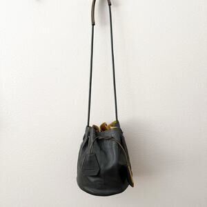Absolutely stunning leather bucket bag from! See dimensions below. Color is a very dark gray with blue and green undertones - almost looks like a very dark teal. Drawstring with long Crossbody/shoulder strap. Worn once.