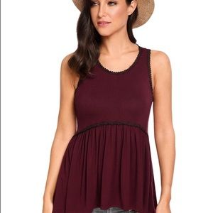 RACER BACK Hi-Low hem Tank blouse nice soft flattering material exposed zipper can be dressed up or down Cranberry w/Black Trim nice amount of stretch true to un-stretched size can accommodate up to 34 DD see measurement chart in photos NEW no returns.