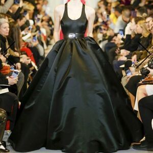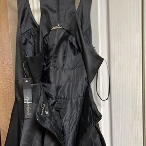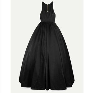 a slim-fitting bodice & a voluminous skirt The back features a striking cutout, which adds to the graphic feel & means the fabric doesn't swamp your frame. built-in cups for added support! side-seam Hidden POCKETS box pleated skirt ballgown silhouette lined Pit to Pit 18”