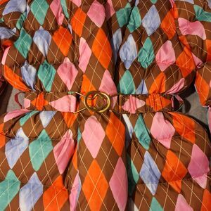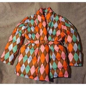 The Rachel Antonoff Toni Argyle Painted Puffer Jacket is a stylish and versatile mid-length jacket perfect for the winter and fall seasons. Made with polyester outer shell and lining, this long sleeve jacket features a colorful argyle/diamond pattern, making it a fashionable choice for various occasions such as travel, parties, or casual wear. With features like a belted closure and a regular fit, this designer jacket from Rachel Antonoff is a must-have for women looking to stay warm and on-trend.