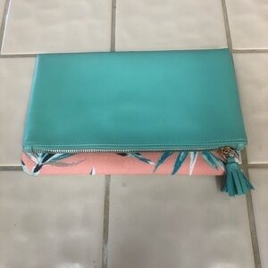 Rachel pally reversible clutch, colors are pale pink blue white green and seafoam color, measurement shown, inside divider as shown, gold zipper closure with tassel, tropical theme, clutch may be worn in two ways for different design displays. Minor mark as shown.