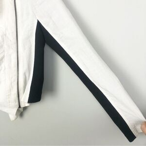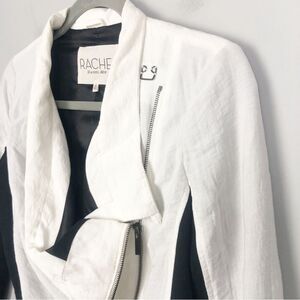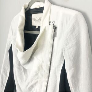 Adorable white Moto style asymmetrical jacket with black accents by RACHEL Rachel Roy. Lightweight. Black details. Asymmetrical zip front and hook clasp. Easy to dress up or down. Some minor spots from make up as shown in last photo & on the inner corner as shown in second to last photo but needs to just be dry cleaned again. Womens size extra small.