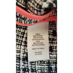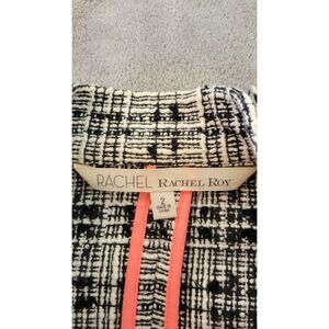 RACHEL ROY Black White Safety Pin Beaded Fringe Tweed Blazer Jacket. Size 2. Does have some makeup stains. Elevate your style with the RACHEL ROY Black White Safety Pin Beaded Fringe Tweed Blazer Jacket. This statement piece blends sophisticated tweed with playful embellishments, featuring intricate beaded fringe details and chic safety pin accents. The timeless black and white color combination offers versatile wear, while the eye-catching design adds a modern twist to a classic silhouette. Perfect for both day and evening, this jacket is a must-have for fashion-forward individuals who love to mix elegance with a touch of edgy glam. Dress it up or down for a look that’s sure to turn heads.