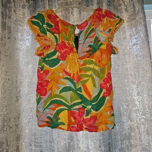 Super cute top in a floral pattern with intricate yellow crochet along the flutter sleeves.