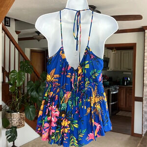 RACHEL ROY Top Womans Small Blue Floral Drawstring Halter Flowy Top. Open V-neck front with adjustable tie drawstrings.