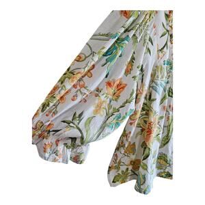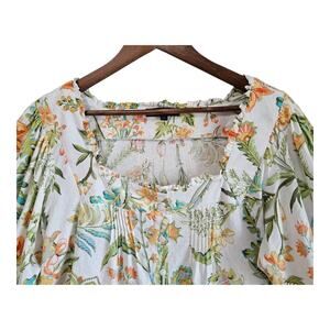RACHEL ROY Women's Size L Blouse - Cropped, Button Up, Floral, Green, Orange, White, Square Neck, 3/4 Puff Sleeve, 55% Linen, 45% Rayon