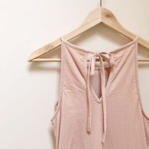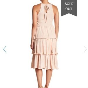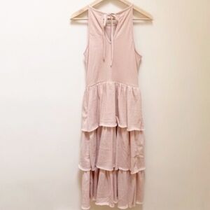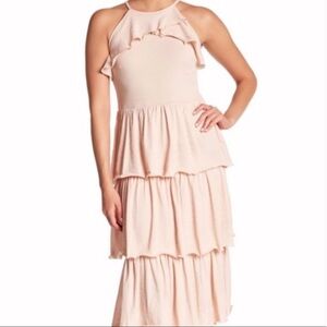 Chic blush midi dress with tiered design. Sleeveless with a halter neckline. Perfect for stylish outings.