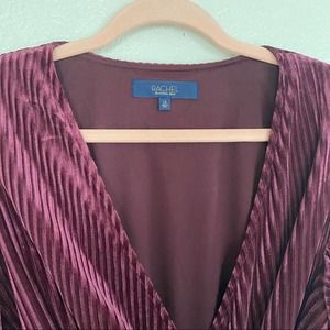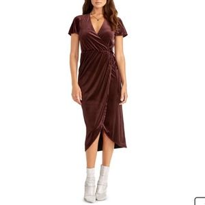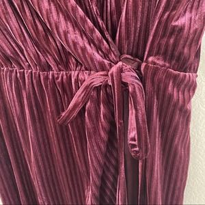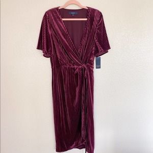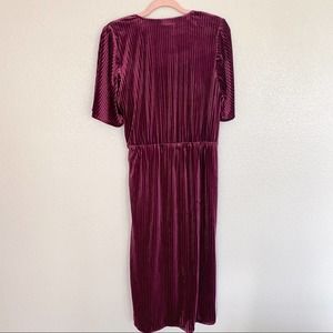 Elegant burgundy midi dress. Features a wrap design. Short sleeves and V-neckline. Perfect for any occasion.