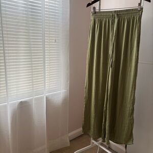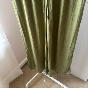 Beautiful olive green wide leg palazzo pants by Rachel Rachel Roy! These flowy pants feature an elastic waistband for comfortable all-day wear. Perfect for casual outings or dressing up with heels.