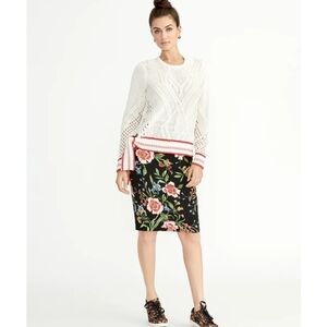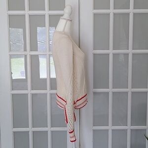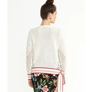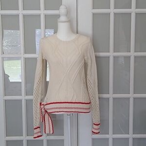 Our favorite sweater of the season because it works with everything! The red striping and side tie gives it a modern & fresh feel. Relaxed fit sweater with open cable knit weave along sides and sleeves.