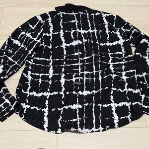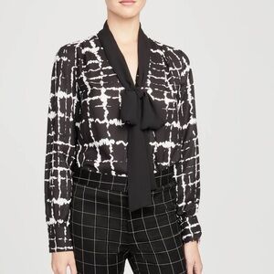 Elegant blouse with a striking black and white pattern. Features a sophisticated tie-neck design.