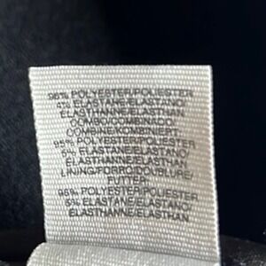 Black “Gwen” dress pants with a blue and white stripe on wearer’s left side. Two back patch pockets. Flat front. Double hook and bar with zip closure and interior button.