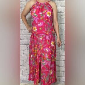 Charming pink skirt set with vibrant yellow floral accents. Smocked waistband for comfort. Skirt is 33” long. I wore this only one time on a trip to Greece. Excellent condition!