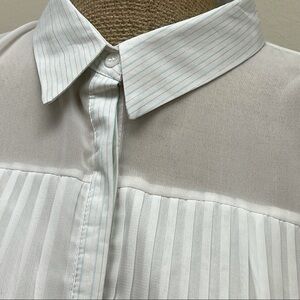 Long sleeve, sheer upper portion, sheer pleated overlay, Small pinstripes, size small