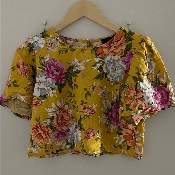 Chic yellow blouse with vibrant floral design. Features short sleeves and a round neckline. Ideal for casual outings.