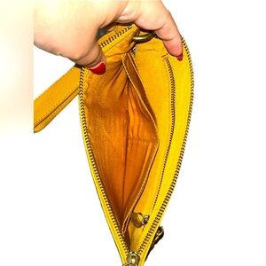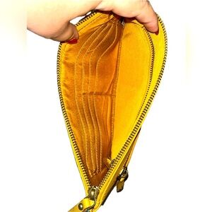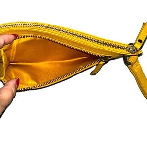 Brighten your look with this stylish yellow leather wristlet clutch. Perfect for any occasion.