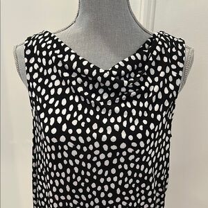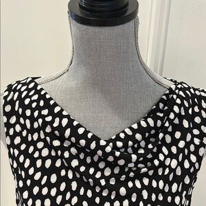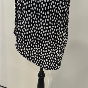 This elegant blouse by RACHEL Rachel Roy features an asymmetrical design in a classic black and white color scheme. Scooped neckline. The blouse's unique style and versatile colors make it a standout piece for any wardrobe. Perfect for adding a touch of sophistication to your ensemble. Underarm flat across is 19”. Length, longest part of top is 30”.